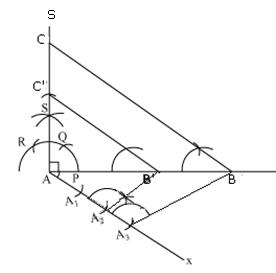 2. Draw an arc of radius 12 cm with B as its centre to intersect SA at C. Join BC to obtain
