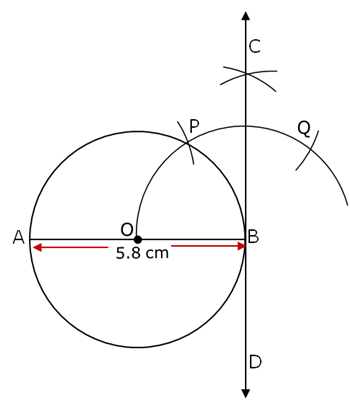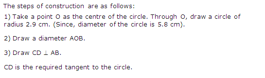 Q6. Draw a circle of diameter 5.8 cm. Draw one of its diameter. Through one of the end points of the diameter, construct tangent to the circle.