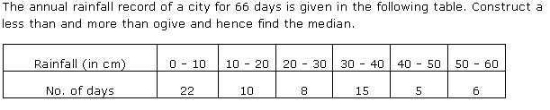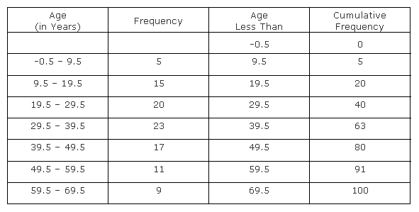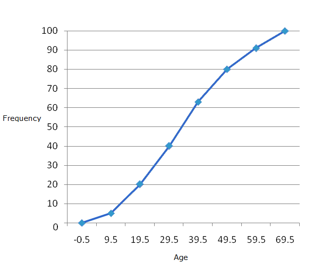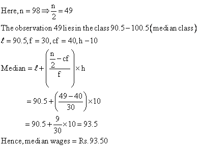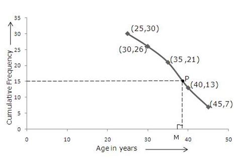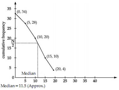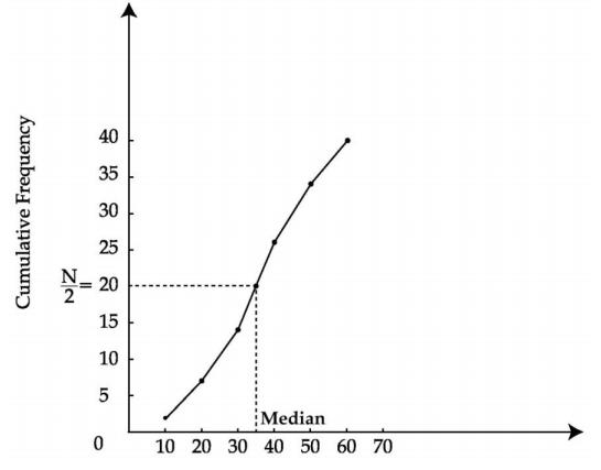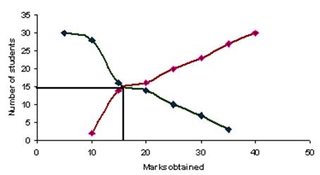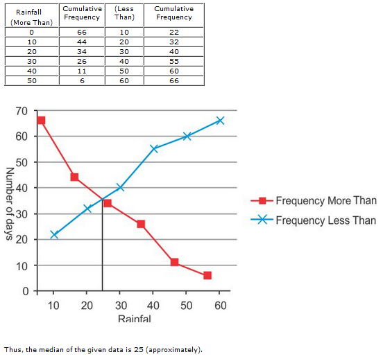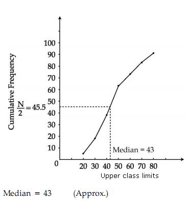In order to find the median, we first locate the point corresponding to 29 on the y-axis let the point be P. From this point, draw a line parallel to the x-axis cutting the curve at Q. From this point Q draw a line parallel to y-axis and meeting x-axis at point M. The x-coordinate of M is the median. Thus, median = 91 (approx).