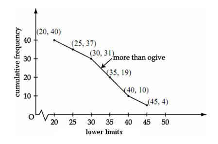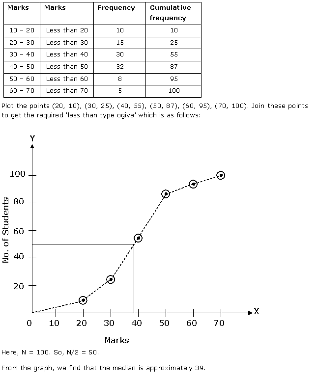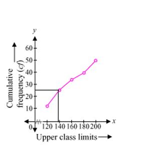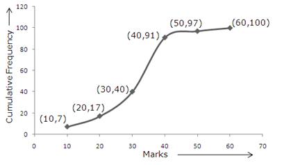 Now we mark the upper class limits along x-axis on a suitable scale and the cumulative frequencies along y-axis on a suitable scale. Plot the points (40, 4), (60, 10), (80, 20), (100, 36), (120, 48), (140, 55) and (160, 58). Now, join the plotted points by line segments as shown.