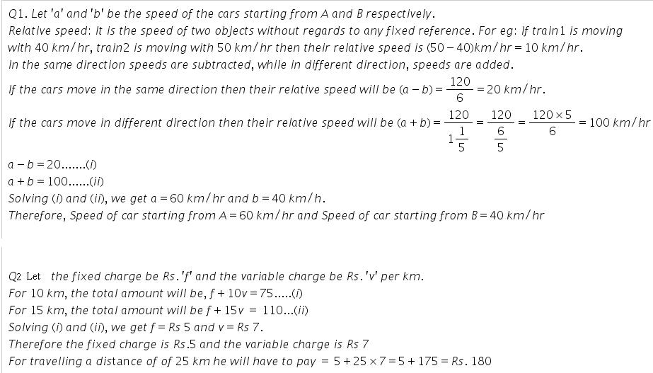 Q.2.A taxi charges in a city comprise of a fixed charge together with the charge for the distance covered. For a journey of 10 km the charge paid is Rs 75 and for the journey of 15 km.The charge paid is Rs.110. What will a person have to pay for travelling a distance of 25 km?