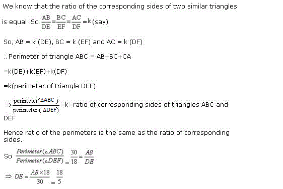 Q122. Two similar triangles ABC and DEF are such that their perimeters are 30 cm and 18 cm respectively.If AB=6,then find DE.